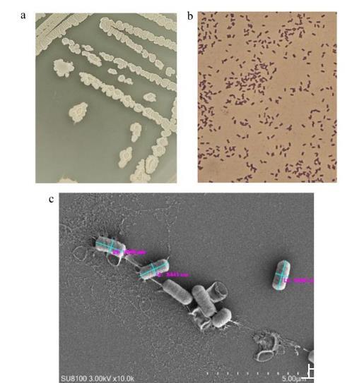 圖2菌株GXUN13068-1的菌落形態(tài)(a)、革蘭氏染色(b)及掃描電子顯微鏡鏡檢形態(tài)(c)