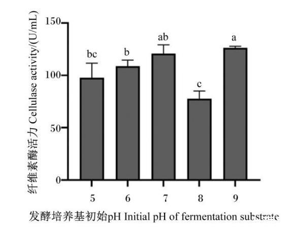 當(dāng)接種量為4%,發(fā)酵時(shí)間為48 h時(shí),發(fā)酵培養(yǎng)基初始pH對(duì)菌株GXUN13068-1產(chǎn)酶能力的影響如圖5所示。當(dāng)發(fā)酵培養(yǎng)基初始pH為9時(shí),菌株GXUN13068-1的產(chǎn)酶能力達(dá)到最大,所產(chǎn)纖維素酶活力為126.37 U/mL。