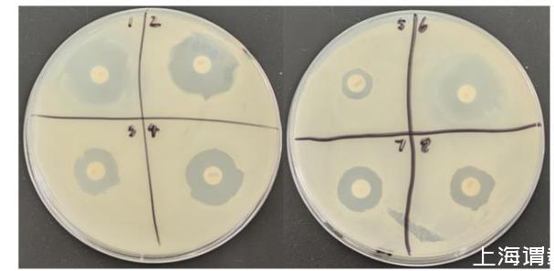 圖6菌株GXUN13068-1的藥敏試驗(yàn)結(jié)果1:氯霉素chloramphenicol;2:新生霉素neomycin;3:新霉素neomycin;4:慶大霉素gentamicin;5:阿莫西林amoxicillin;6:紅霉素erythromycin;7:鏈霉素streptomycin;8:利福平rifampicin。