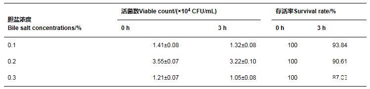 將待測(cè)菌株接種到NB培養(yǎng)基中,搖瓶發(fā)酵24 h,取1 mL待測(cè)菌株發(fā)酵液接種到9 mL膽鹽濃度分別為0.1%、0.2%、0.3%的人工腸液中處理3 h,以0 h的樣品作對(duì)照,計(jì)算菌株存活率。