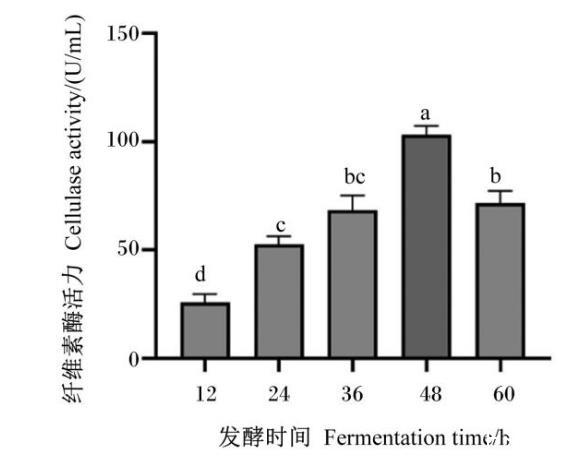 當(dāng)發(fā)酵培養(yǎng)基的初始pH為6,接種量為1%時(shí),發(fā)酵時(shí)間對(duì)菌株GXUN13068-1產(chǎn)酶能力的影響如圖3所示。當(dāng)發(fā)酵時(shí)間為48 h時(shí),菌株GXUN13068-1的產(chǎn)酶能力達(dá)到最大,所產(chǎn)纖維素酶活力為103.24 U/mL。