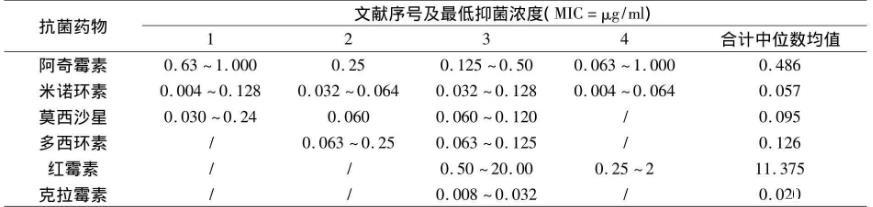 3.3沙眼衣原體(Ct)藥敏檢測由于采用McCoy細胞培養(yǎng)法,其技術要求和實驗條件要求均比較高,因此限制了臨床應用,故藥敏檢測臨床報道的資料較少。本文所綜合的資料顯示:克拉霉素、米諾環(huán)素、莫西沙星有較高的體外抗沙眼衣原體活性,多西環(huán)素、阿奇霉素、紅霉素抗沙眼衣原體活性降低。最低抑菌濃度(MIC=μg/ml)中位數均值依序為0.020、0.057、0.095、0.126、0.486、11.375。且Ct對紅霉素的敏感性降低幅度更大,存在耐藥菌株,其23sRNA基因C2452A、T2611C兩個位點發(fā)生突變導致紅霉素低水平耐藥,L4基因的點突變可能與紅霉菌素耐藥無關。Ct藥敏結果與臨床療效之間明顯相關,在抗沙眼衣原體感染臨床治療中應盡量選用克拉霉素、米諾環(huán)素、莫西沙星等有效藥物。不同藥物聯用,抗Ct活性可出現相反的效果。例如阿奇霉素與莫西沙星、多西環(huán)素或利福平聯合應用,抗Ct活性顯著提高;而米諾環(huán)素與莫西沙星或利福平聯合應用時,彼此之間抗Ct活性降低。