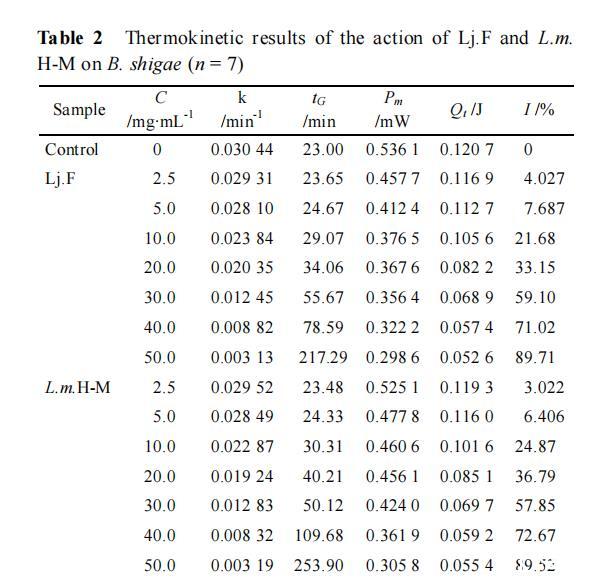 表 2 金銀花和灰氈毛忍冬對志賀痢疾桿菌作用的熱動力學(xué)結(jié)果 (n=7)