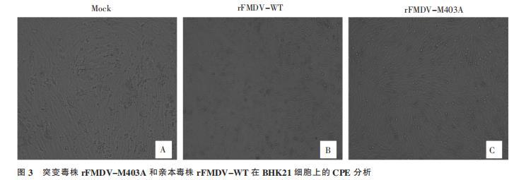 測序正確的全長質(zhì)粒 rFMDV-M403A 與 rFMDV-WT 各取 2.5 μg 與 5 μL Lip3000 混合后,轉(zhuǎn)染生長至 60%~90%的單層 BHK21 細(xì)胞中(步驟見試劑盒說明),同時(shí)設(shè)置正常細(xì)胞作為對照。 轉(zhuǎn)染完成后,置 37 ℃、50 mL/L CO2 恒溫培養(yǎng)箱繼續(xù)培養(yǎng) 48~72 h,每日觀察細(xì)胞病變(cytopathic effect,CPE)情況,約 80%~90%細(xì)胞出現(xiàn)顯著 CPE 時(shí)收獲樣品,經(jīng)-80 ℃冰箱反復(fù)凍融 2~3 次后,在 BHK21 細(xì)胞上連續(xù)傳 10 代,置-80 ℃冰箱保存病毒備用。
