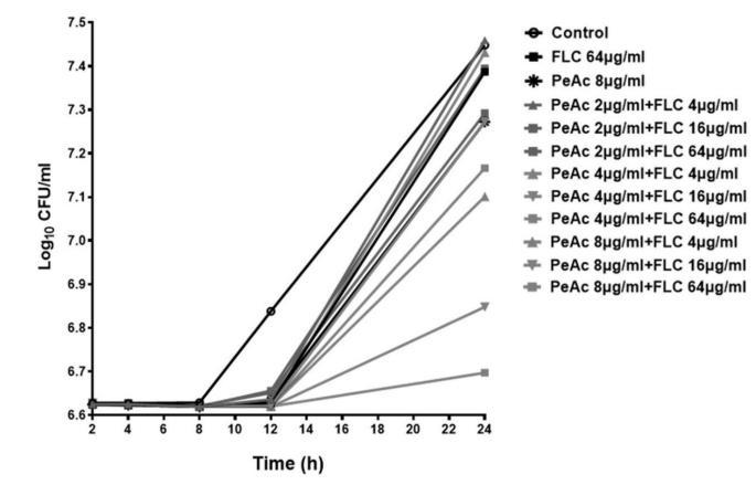值(x)及其相對(duì)應(yīng)的菌濃度(y)作圖得到標(biāo)準(zhǔn)曲線。隨后用RPMI 1640液體培養(yǎng)基稀釋并調(diào)整菌液濃度至1×106cells/ml。將菌液分成數(shù)份,轉(zhuǎn)移至50ml離心管,每管10ml。每管菌液中分別加入不同濃度(2、4、8μg/ml)的待測(cè)藥物PeAc,隨后在加入2μg/ml PeAc的幾個(gè)管中又分別加入不同濃度(4、16、64μg/ml)的FLC,4、8μg/ml PeAc的幾個(gè)管中進(jìn)行同樣的操作。最后剩余3管,一管只加8μg/mlPeAc,一管只加64μg/ml FLC,一管不加藥。所有含菌液的離心管于30℃恒溫震蕩培養(yǎng)箱中,以200rpm振蕩培養(yǎng),分別于0、2、4、8和12h時(shí)在各組菌液中吸取100μl于96孔板中(取之前渦旋混勻各管菌液)測(cè)各孔的OD630,利用標(biāo)準(zhǔn)曲線擬合的方程計(jì)算各組不同培養(yǎng)時(shí)間節(jié)點(diǎn)的菌濃度,并以log10 CFU/ml對(duì)時(shí)間作曲線。實(shí)驗(yàn)結(jié)果見下圖,PeAc與氟康唑聯(lián)用抗耐藥真菌的量效關(guān)系的測(cè)定結(jié)果示意圖。