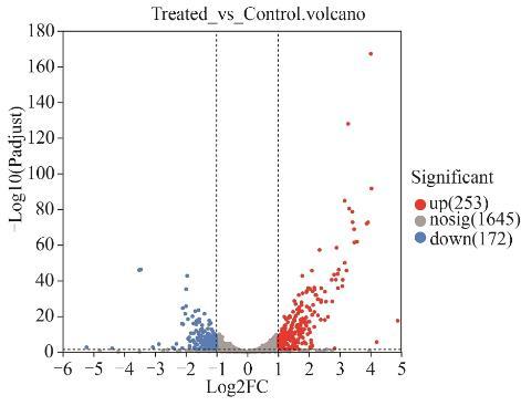 對樣本采用DESeq 2分析,篩選條件設為Padj<0.05且|Log 2(fold change)|≥1.5以獲得差異顯著表達基因。結(jié)果顯示共有425個差異表達基因,其中253個基因表達被滇黃精水提物干預上調(diào),172個基因表達被滇黃精水提物干預下調(diào)。說明經(jīng)過滇黃精水提物處理的L.reuteri 1.2838許多基因在mRNA水平有差異表達(圖3)。