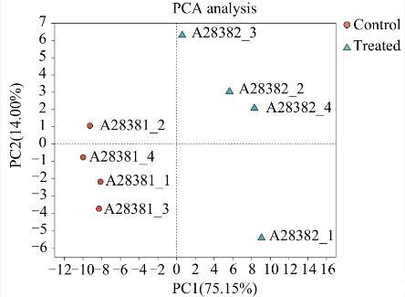 主成分分析(PCA)顯示,正常組和滇黃精水提物組呈現(xiàn)顯著分離,表示組間差異明顯。在PCA圖中,樣本點之間的聚集程度反映了樣本之間的相似性。如圖2所示,給藥組樣本點之間距離較近,說明樣本之間的差異性較小,表明樣品制備合理可用于后續(xù)分析。