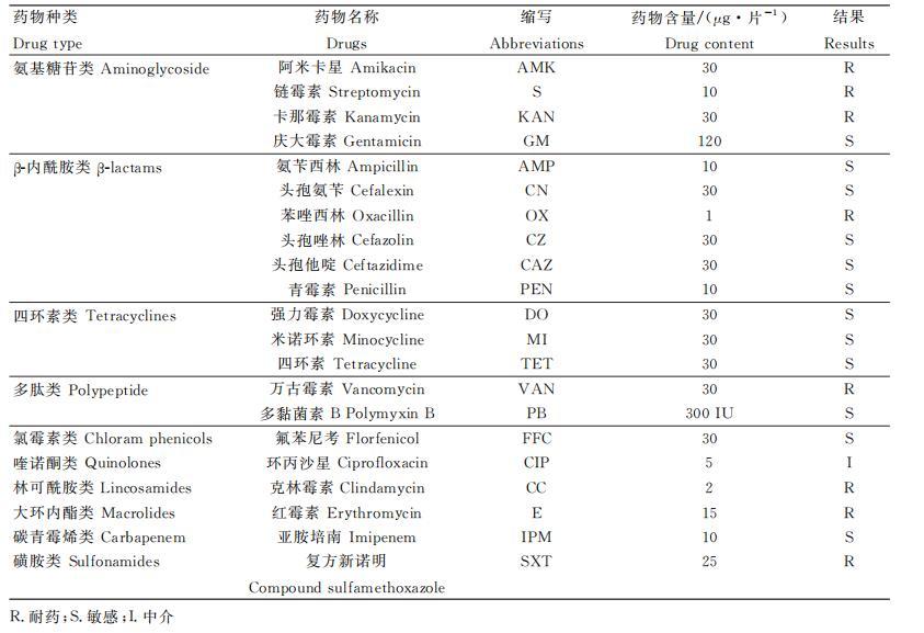 藥敏試驗結(jié)果如表2所示,該菌株對阿米卡星、多黏菌素 B、鏈霉素、卡那霉素、克林霉素、復方新諾明多重耐藥,對氨基糖苷類藥物耐藥最為明顯,對β-內(nèi)酰胺類藥物最為敏感。