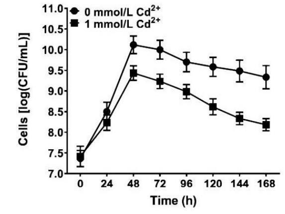 濃度為1mM。將不含Cd2+的培養(yǎng)液作為對照。培養(yǎng)物在30℃下以180轉(zhuǎn)/分鐘振蕩144小時,并測量菌落形成單位(CFU)以生成生長曲線。