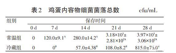 檢測結果雞蛋內容物菌落總數(shù)檢測結果見表2。由表2可知,保存前雞蛋內容物中沒有檢出細菌,隨存放時間的延長,常溫與冷藏條件下細菌總數(shù)均不斷增加,但差異明顯。常溫條件下保存7d的雞蛋內部已經有細菌滋生,14——21d菌落總數(shù)迅速增長,21d后菌落總數(shù)增幅仍較明顯。冷藏條件下保存7d雞蛋內容物未檢出細菌,保存14d、21d、28d雞蛋內容物細菌菌落總數(shù)均極顯著低于常溫保存組(P<0.01)。