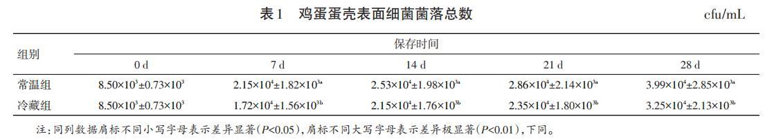 保存前隨機選取3個雞蛋,先采樣測定該批次雞蛋蛋殼表面細菌總數(shù),然后用此3個雞蛋取樣測定蛋內容物細菌總數(shù)。保存雞蛋隨機分為2組,常溫組室溫保存,冷藏組存放于冰箱4℃冷藏室,每組各60個。分別于保存7、14、21和28d隨機取常溫組、冷藏組雞蛋各3個進行蛋殼與蛋內容物細菌總數(shù)培養(yǎng)測定,對比分析各組細菌生長繁殖規(guī)律與差異。