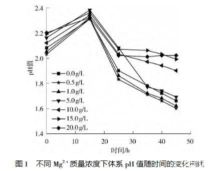 從圖1中可以看出,整個(gè)培養(yǎng)過(guò)程中體系pH值呈先升高后逐漸下降的趨勢(shì)。這是因?yàn)樵谂囵B(yǎng)初期,氧化亞鐵硫桿菌氧化Fe2?為Fe3?,消耗大量H?,從而導(dǎo)致體系pH值升高;隨著培養(yǎng)過(guò)程的進(jìn)行,F(xiàn)e3?發(fā)生水解使培養(yǎng)體系酸度增加,導(dǎo)致體系pH值下降。Mg2?的存在使得體系pH值隨時(shí)間的變化趨勢(shì)發(fā)生了較大變化,當(dāng)Mg2?質(zhì)量濃度≤1.0 g/L時(shí),pH值下降速度較快,在45 h時(shí)Mg2?質(zhì)量濃度為0.0、0.5、1.0 g/L的體系pH值分別下降到1.66、1.60、1.62;而當(dāng)Mg2?質(zhì)量濃度≥5.0 g/L時(shí),pH值下降較慢,在45 h時(shí)Mg2?質(zhì)量濃度為20.0 g/L的體系pH值僅下降到2.02。