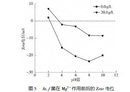 At.f菌在Mg2?質(zhì)量濃度為0.0、20.0 g/L體系中培養(yǎng)后,其表面電位隨pH值的變化曲線如圖5所示。
