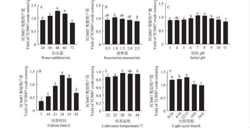 按培養(yǎng)基中大米質(zhì)量為72 g情況計(jì),當(dāng)加水量為48 mL時(shí),TCS007菌株粗提發(fā)酵產(chǎn)物產(chǎn)量最高,為1.32 g(圖2A);當(dāng)接種量為1 mL(孢子含量1×107個(gè)/mL)時(shí),粗提發(fā)酵產(chǎn)物產(chǎn)量最高,為1.03 g(圖2B);當(dāng)初始pH為5.0時(shí),粗提發(fā)酵產(chǎn)物產(chǎn)量最高,為1.06 g(圖2C);當(dāng)培養(yǎng)時(shí)間為28 d時(shí),粗提發(fā)酵產(chǎn)物產(chǎn)量最高,為1.34 g(圖2D);當(dāng)培養(yǎng)溫度為28℃時(shí),粗提發(fā)酵產(chǎn)物產(chǎn)量最高,為0.96 g(圖2E);當(dāng)光照周期為12 h/12 h時(shí),粗提發(fā)酵產(chǎn)物產(chǎn)量最高,為1.28 g(圖2F)。