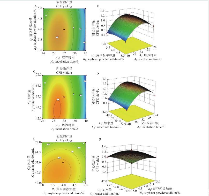 圖3棘孢木霉TCS007菌株粗提發(fā)酵產(chǎn)物產(chǎn)量關(guān)鍵影響因素等高線(A、C、E)和響應(yīng)曲面(B、D、F)
