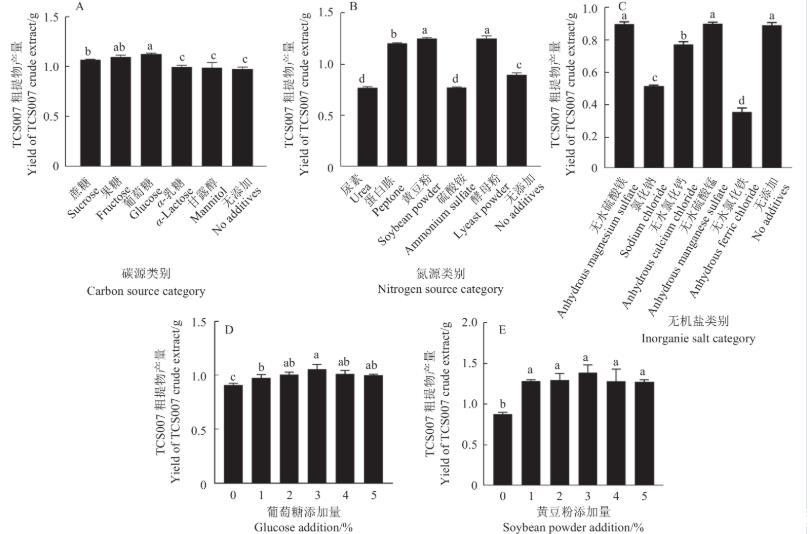 圖1 TCS007菌株固態(tài)發(fā)酵培養(yǎng)基組分單因素優(yōu)化試驗(yàn)結(jié)果