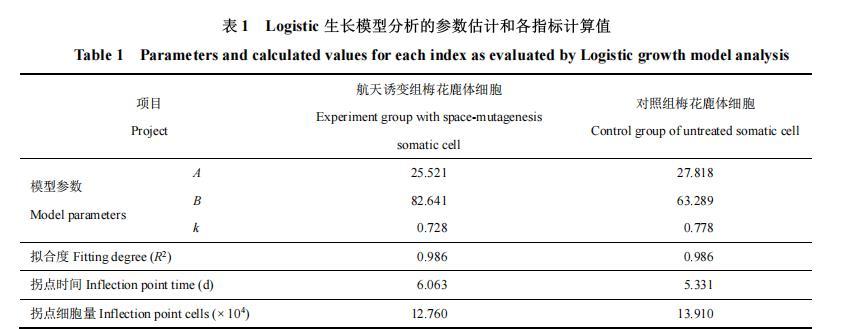 Logistic曲線模型能很好地擬合3組航天誘變組和對照組梅花鹿體細胞的生長曲線(表1),擬合度(R2)均接近1,說明其生長曲線的擬合度很好。拐點時間是細胞量增加速度由快到慢的轉(zhuǎn)折點,梅花鹿航天誘變組體細胞的拐點時間大于對照組拐點時間,即對照組梅花鹿體細胞早于航天誘變組樣品到達生長拐點。而從拐點細胞量來看,梅花鹿體細胞對照組的生長速度大于航天誘變組。