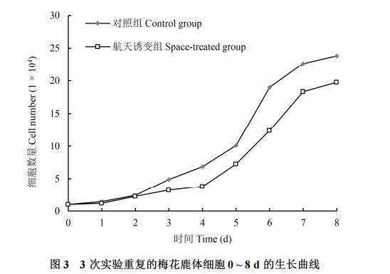 根據(jù)3次實驗重復數(shù)據(jù)平均值得到的航天誘變組和對照組梅花鹿體細胞的生長曲線,總體均呈“S”型生長趨勢,對照組梅花鹿體細胞經(jīng)培養(yǎng)2 d后進入對數(shù)生長期,航天誘變組梅花鹿體細胞經(jīng)培養(yǎng)4 d后進入對數(shù)生長期。兩個體細胞系的細胞都在培養(yǎng)7 d后出現(xiàn)生長速度減慢的現(xiàn)象。由此得出航天誘變的梅花鹿體細胞能夠在體外培養(yǎng)生長正常。通過3次實驗重復結(jié)果來看,每個細胞系生長曲線分析結(jié)果穩(wěn)定(圖3)。