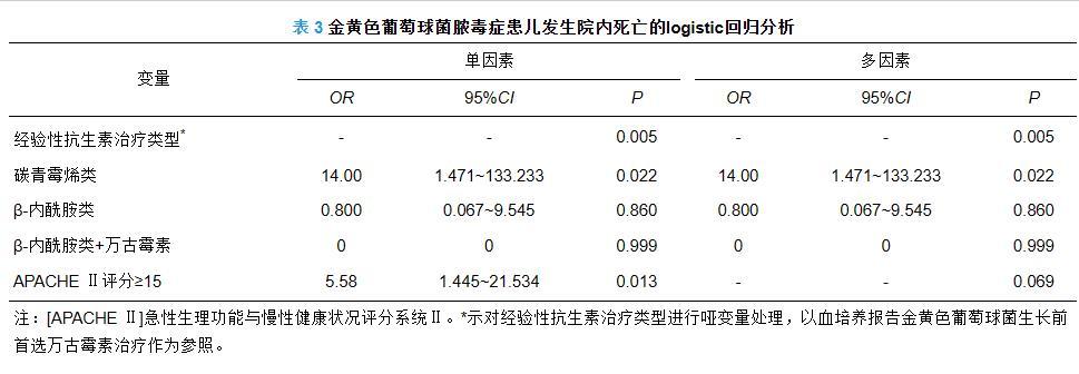 表3金黃色葡萄球菌膿毒癥患兒發(fā)生院內(nèi)死亡的logistic回歸分析