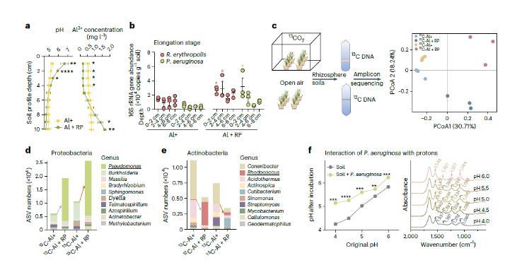 圖4、a)不同土壤剖面深度的pH和Al3+濃度。b,通過qPCR確定SynCom的定植。紅色和綠色星號表示相同土壤深度下Al+RP的豐度顯著高于Al+。c–e,通過13 C-DNA-SIP測定SynCom對細(xì)菌群落的影響。在c中,顯示了微生物群落結(jié)構(gòu)的差異。d中顯示了變形菌的群落組成。在e中,顯示了放線菌的群落組成。f,不同pH值下銅綠假單胞菌與質(zhì)子的相互作用。左圖:接種銅綠假單胞菌提高了原始pH值。右圖:銅綠假單胞菌在不同pH值下的衰減全反射傅里葉變換紅外光譜。