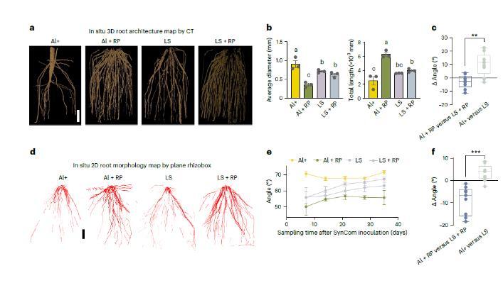 圖3、a)通過X射線CT技術(shù)無損可視化土壤下南京46水稻根系結(jié)構(gòu)的原位3D結(jié)構(gòu)。b、c、CT圖像顯示的根直徑、總長度和根角度的差異。d,通過rhizobox方法和根圖繪制南京46的原位二維水稻根系結(jié)構(gòu)。e,南京46在根箱中根角的時間動態(tài)。f,南京46號水稻的根角差異。
