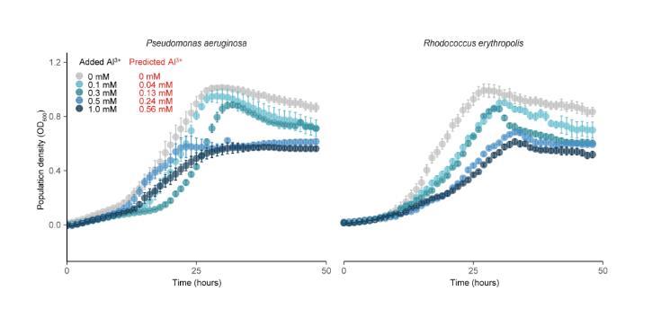 圖2、耐鋁菌株的鑒定。不同Al3+濃度下紅綠假單胞菌和銅綠假單胞菌的生長曲線。圖中黑色和紅色字母分別表示實(shí)驗(yàn)設(shè)置Al3+濃度和Geochem-EZ預(yù)測的游離Al濃度。