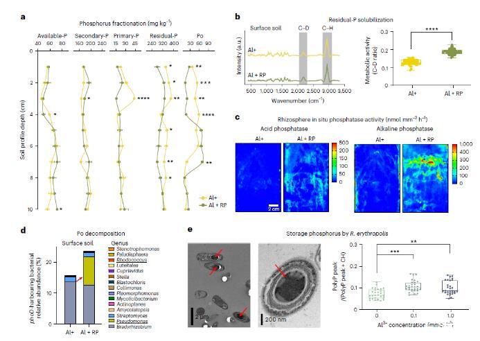圖5、a,不同土壤剖面深度的磷的不同形式和分?jǐn)?shù)。Po代表有機(jī)磷。數(shù)據(jù)表示為三個生物重復(fù)的平均值±sem。采用雙側(cè)不配對t檢驗(yàn)方法進(jìn)行統(tǒng)計(jì)顯著性檢驗(yàn)。b、Al+和Al+RP作用下表層土壤微生物群落殘留磷的釋放能力。c,根際原位磷酸酶活性。d,伸長階段根際表層土壤中排名前15位的含有磷的細(xì)菌屬。e,R.erythropolis的透射電子顯微鏡圖像和R.erythropolis的PolyP帶的拉曼光譜。