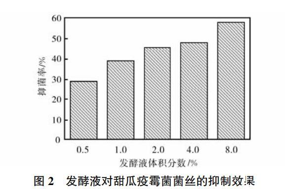 由圖2可以看出,植物乳桿菌Bx6-2的發(fā)酵液對甜瓜疫霉菌菌絲生長有很強的抑制作用,菌絲抑菌率隨發(fā)酵液濃度的降低而減少。當發(fā)酵液濃度為8%時,植物乳桿菌Bx6-2的抑菌率達到了58%,而當發(fā)酵液濃度降至0.5%時,其抑菌率仍可達到30%。