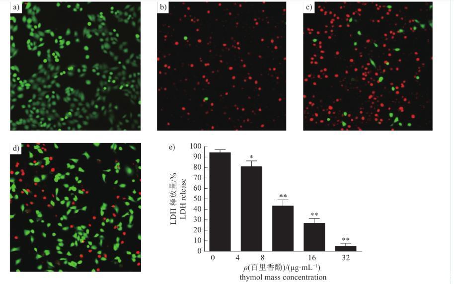 通過Live/Dead試劑盒染色,在激光共聚焦顯微鏡下可觀察到綠色熒光的為活細胞,紅色熒光的為死細胞。試驗結(jié)果表明:百里香酚可以提高由金葡菌Hla介導的A549細胞損傷的保護率(圖3a~d),隨著百里香酚質(zhì)量濃度的增加,死細胞數(shù)量減少,活細胞數(shù)量增加。