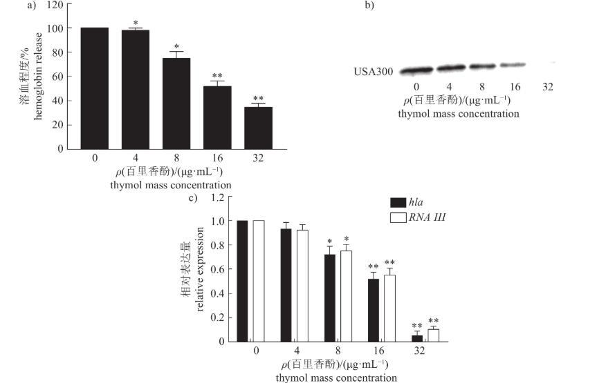 注:a)不同質(zhì)量濃度百里香酚與金葡菌培養(yǎng)上清液對兔紅細胞的溶血作用;b)不同質(zhì)量濃度百里香酚對金葡菌USA300 Hla表達影響的免疫印跡結(jié)果;c)不同濃度的百里香酚對金葡菌USA300的hla和RNAⅢ相對基因表達量的影響。*.P<0.05,**.P<0.01;下同。