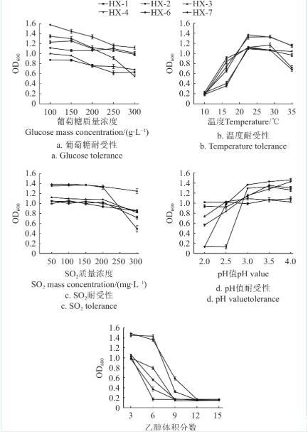 本土NS菌株對(duì)葡萄酒相關(guān)釀造因子的耐受性見圖2。除HX-6菌株外,其余菌株的生物量均隨葡萄糖質(zhì)量濃度的增加而呈現(xiàn)下降趨勢。葡萄糖質(zhì)量濃度達(dá)到300 g/L時(shí),HX-1、HX-3、HX-4菌株的OD600值明顯低于其他菌株(圖2a),表明其在高糖分條件下受到的抑制作用更強(qiáng)。由圖2b可知,所有菌株在10℃的低溫條件下均無法生長;15℃條件下,HX-2和HX-4菌株的生長情況明顯弱于其他菌株,而在35℃時(shí),HX-1、HX-3菌株生長活力明顯下降。整體而言,同一種屬菌株對(duì)發(fā)酵溫度的耐受性具有一定相似性,不同種屬菌株對(duì)發(fā)酵溫度的耐受性存在明顯差異。