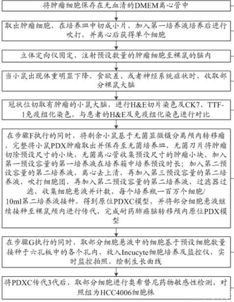 步驟G:在步驟F執(zhí)行的同時(shí),將剩余小鼠基于無菌顯微鑷分離顱內(nèi)轉(zhuǎn)移瘤,完整將小鼠PDX腫瘤取出并保存至無菌培養(yǎng)皿,無菌刀片將腫瘤切除預(yù)設(shè)尺寸的小塊,無菌離心管收集預(yù)設(shè)尺寸的腫瘤小塊,加入第一預(yù)設(shè)容量的第一培養(yǎng)液在培養(yǎng)箱中培養(yǎng)預(yù)設(shè)時(shí)長;加入第二預(yù)設(shè)容量的第二培養(yǎng)液,離心去上清,再加入第三預(yù)設(shè)容量的第二培養(yǎng)液,吹打細(xì)胞團(tuán),再加入第二預(yù)設(shè)容量的第二培養(yǎng)液,過濾器過濾,收集細(xì)胞懸液并計(jì)數(shù),每個(gè)培養(yǎng)瓶一百萬個(gè)細(xì)胞/10ml第二培養(yǎng)液接種,得到原位PDXC模型,并將部分細(xì)胞懸液繼續(xù)接種至裸鼠顱內(nèi)進(jìn)行傳代,完成耐藥肺癌腦轉(zhuǎn)移顱內(nèi)原位PDX模型;